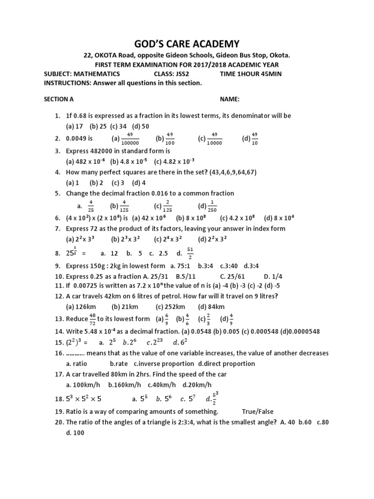 Mathematics Exam Questions And Answers For Jss2 Teststreams